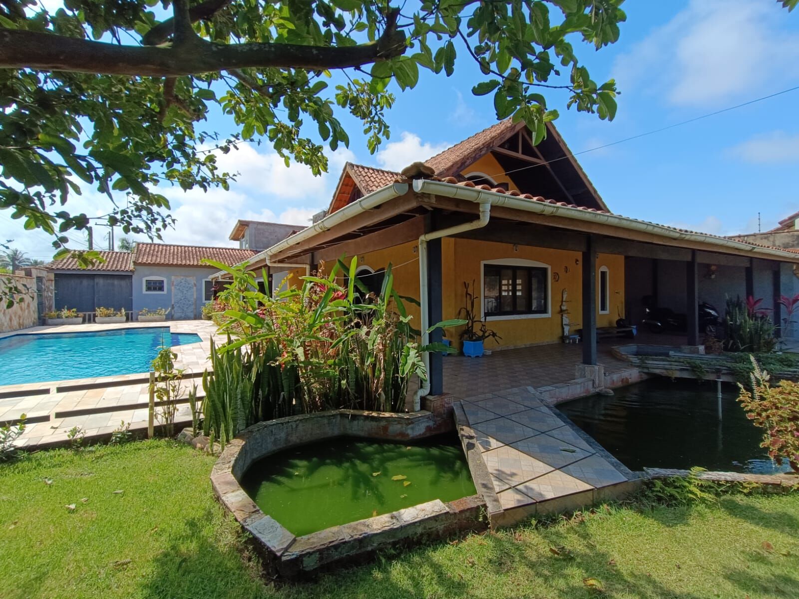 📌 Quintal amplo com jardim, paisagismo e um lindo lago de carpas